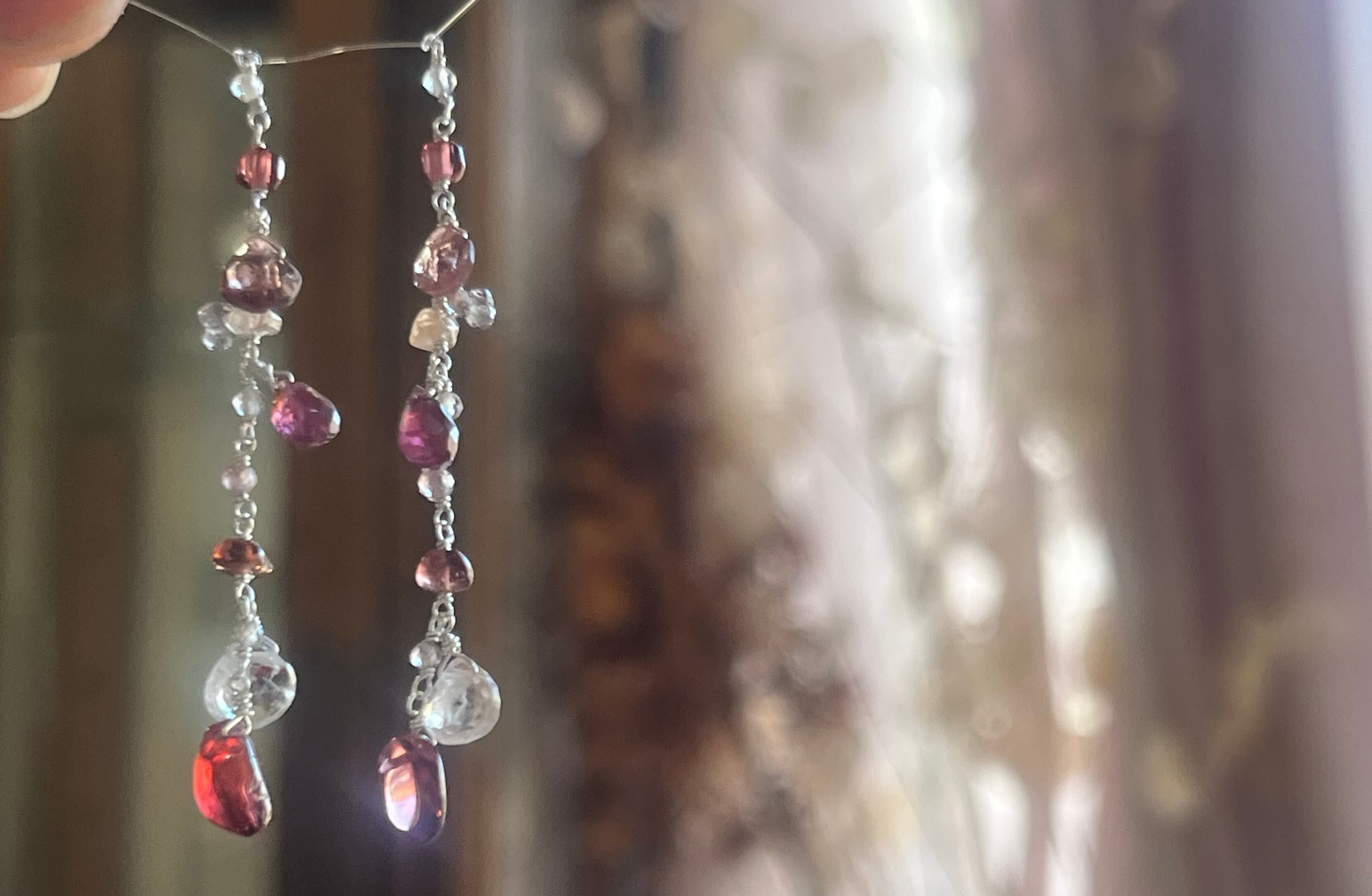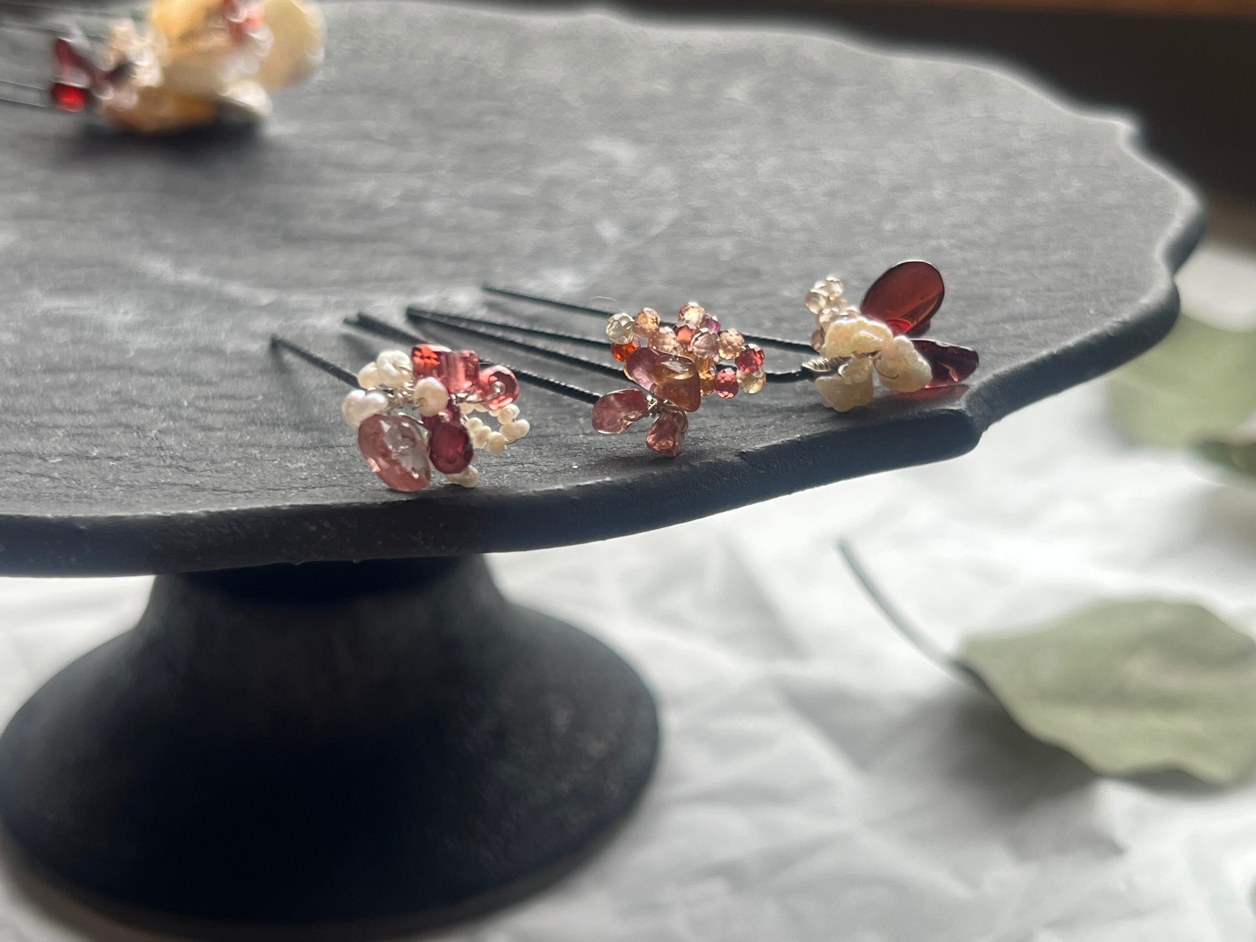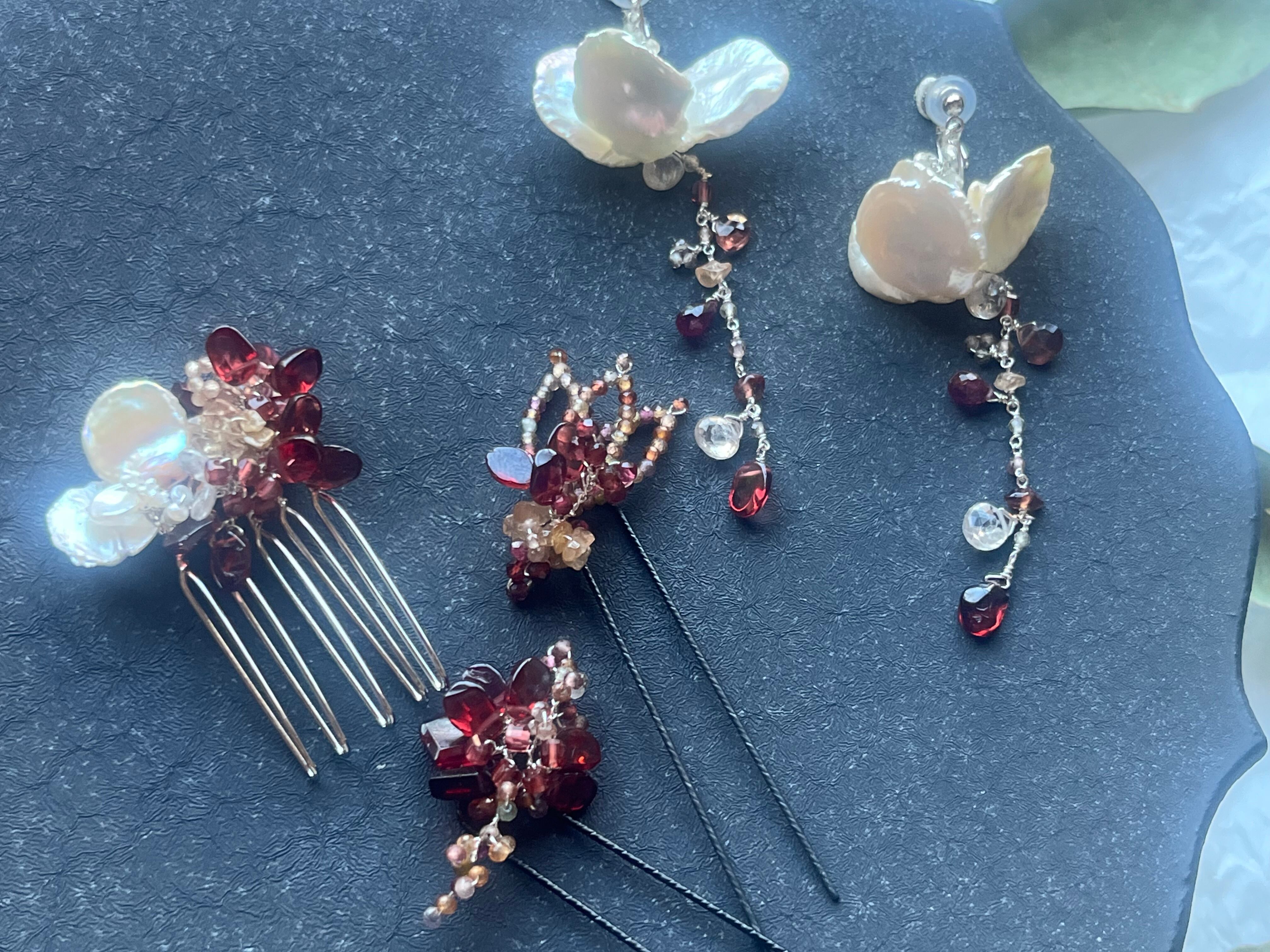 絶妙なカラーのガーネットをメインにジルコンやスピネル、淡水真珠などをふんだんに使用したオリジナルヘアアクセとイヤリングのセットです。