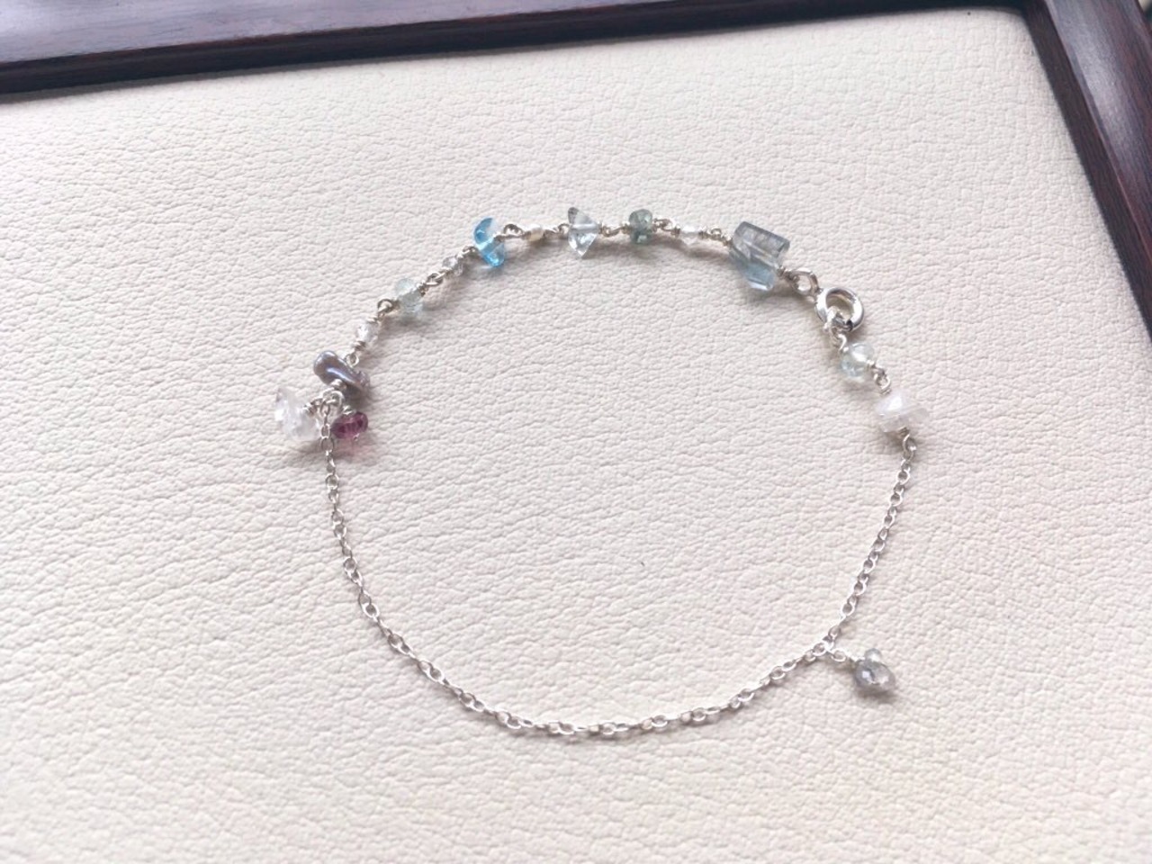タンブルカット、ボタンカット、ラウンドカット、チップの4種のアクアマリンをメインに、爽やかな色味の天然石や淡水真珠を使用した涼しげなブレスレット。